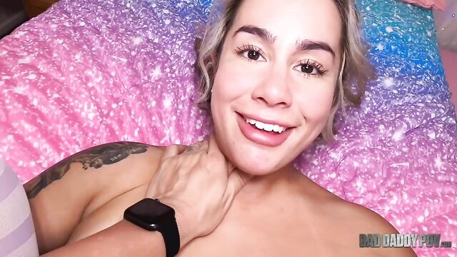 Description: Blonde teen Misty Meaner catches her stepdaddy watching porn and can't help but to be turned on. This horny slut immediately starts touching her pussy before begging to taste her stepdads cock. Things move from the living room to the bedroom and Misty wastes not time before she climbs on top of his cock with her juicy ass bouncing around as they start fucking. Watch as this slutty teen in pigtails get her tight pink pussy stretched open.