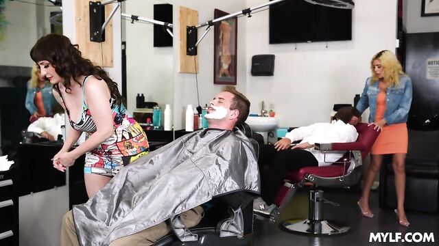 Description: Handsome attorney Nicky walks into a barbershop asking for a haircut and hot mylf Melody is more than happy to make room for him. She’s turned on by powerful men so she can’t help shoving her big tits on his face as she cuts his hair, when she’s done she’s happy to notice that Nicky has a huge boner. A month later he comes back for another haircut, this is Melody’s chance to offer him her especial services which include sucking and riding his huge cock!