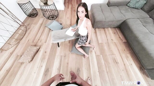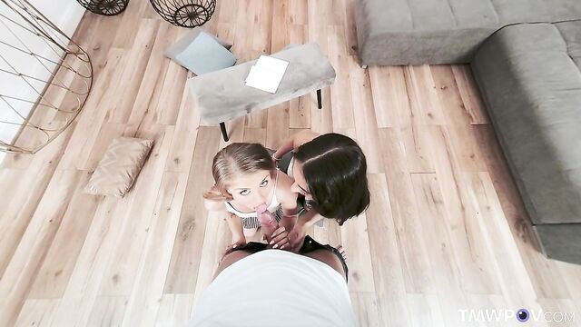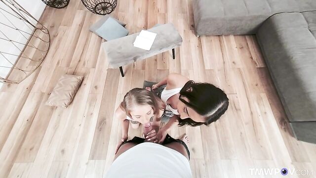 Description:Two best friends Bonnie Dolce and Lola Heart are preparing for exams. Lola is so engrossed in her reading that she doesn't notice when Bonnie leaving the room. She also doesn't notice when Bonnie's boyfriend enters the room and watches her. He sees that that Lola is without panties today, and her sexy ass, visible from under the skirt, instantly excites him. He takes out his dick and starts jerking it. But soon Lola catches him peeping, and instead of asking him to explain the situation, she suggests that he needs some help with his boner and decides to suck his big cock. Bonnie returns to the room at the most inopportune moment. She is so angry because her best friend Lola is sucking cock of her boyfriend. But caring Bonnie knows that having a threesome is the deepest fantasy of her boyfriend. So, she joins them and proceeds to share the boyfriend’s cock with her best friend Lola getting great pleasure from threesome sex.