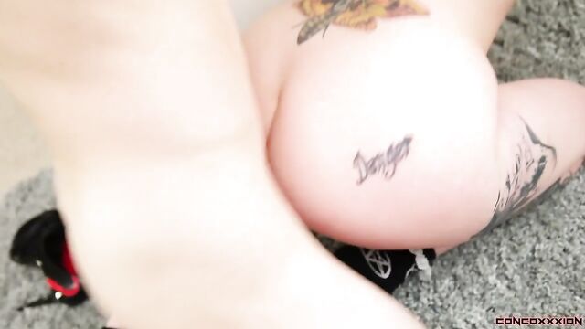 Description: Gorgeous tattooed goth beauty, Ophelia Rain, is wearing a sexy black onesie... and begins to slowly dance and show off her body. Ophelia bends over, and slaps her ass. She shakes her ass, and begins to strip off her onesie. Ophelia pulls her big tits out of her onesie, then unsnaps the bottom and begins to play with herself. She completely strips off the onesies, and bends over. Ophelia plays with her pussy and her asshole at the same time. Ophelia crawls over to Conor's cock, and begins to suck and stroke him. Conor plays with Ophelia's big boobs as he face fucks her. Ophelia then lays back as Conor licks and fingers her. Conor shoves his cock deep inside of Ophelia's wet pussy, and fucks her hard. She sucks Conor's cock a little more, before he licks her asshole. Conor sticks his cock back inside of Ophelia's pussy, and she screams out. Ophelia begs for Conor to shove it in her ass and fuck her. Conor pulls out, and fucks Ophelia in the ass. 'Shove that big dick in my ass! Give me all of it.' Conor pulls Ophelia by the back of the head, and fucks her ass hard. She lays on her back while Conor fucks her ass while she's spread open. Conor fucks Ophelia until he cums deep inside of her asshole.