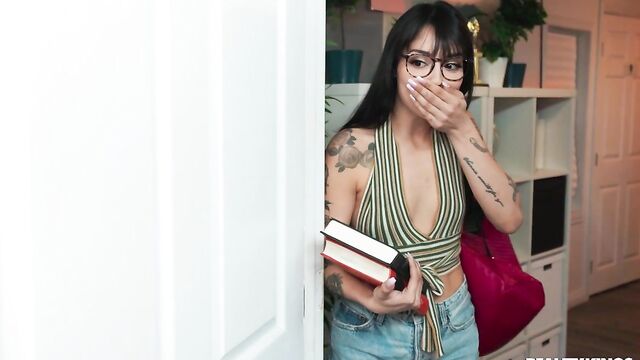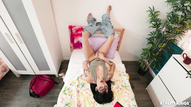 Description:Laney Grey brings her BF Hollywood Cash back to her dorm for a BJ, but they attract an audience: her horny nerd neighbor, Vanessa Sky. Vanessa watches them through the open door, touching herself, then goes into her room to eavesdrop some more. Before they can start banging, Vanessa bangs on the wall! Hollywood comes over to see what the ruckus is and finds her playing with her pussy, so he hurries to eat it. Vanessa sucks his huge dick and gets it all for herself while her neighbor is none the wiser.