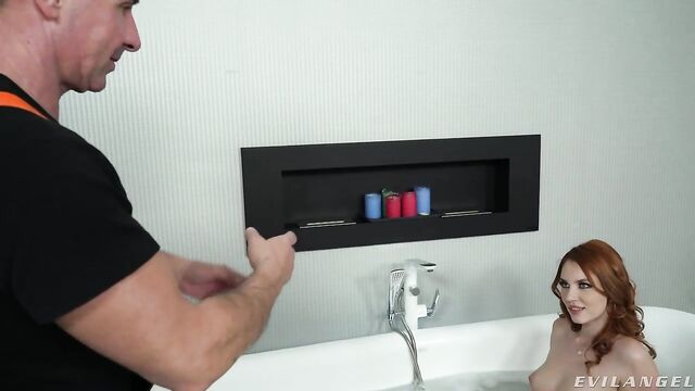 Description: Exquisite redhead Leya Desantis reclines in sexy black heels, stockings and lingerie. Fair-skinned Leya calls repairman David Perry over to inspect her bathtub. David's busy working as she enters, strips and gets into the tub. Stunned David succumbs to her seductive ways, letting her suck his cock. He slips his schlong up her slippery cunt. Leya's natural tits jiggle as her shaved slit massages his meat. David tongues her butthole in a pervy rim job. Leya takes a doggie-style anal reaming. The repairman drills her flowering, pink asshole to gaping! Leya tastes her backdoor flavor with an ass-to-mouth blowjob. And he fingers her twat to a squirting orgasm! David poles her holes relentlessly. The crimson-haired babe strokes his flesh rod until he spews his foamy nut onto her pierced tongue. Sticky-chinned Leya plays with his sperm, drooling it onto her boobs.