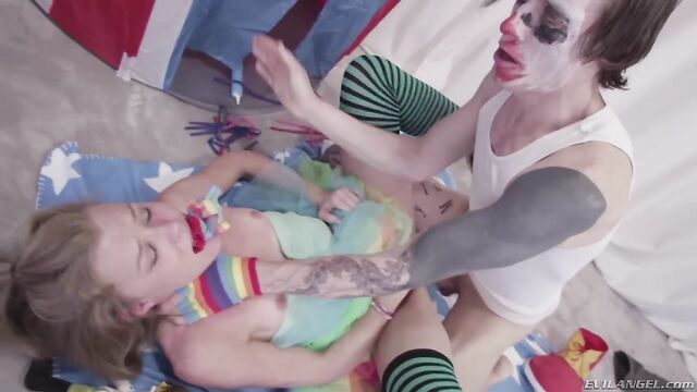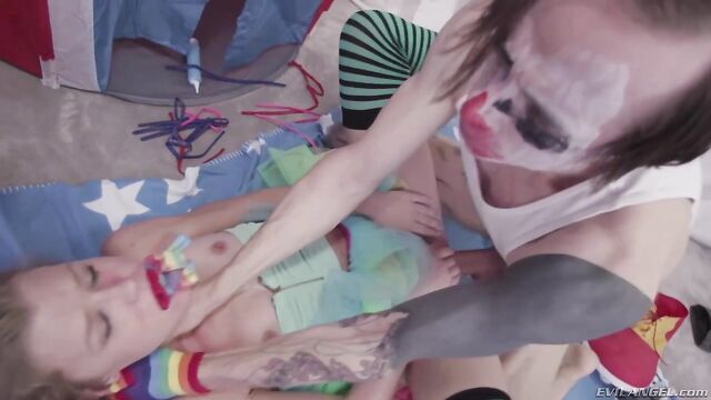 Description: Young blonde Nicole Clitman loves cramming giant lollipops down her throat, so creepy clown Owen Gray arrives to satisfy her oral fixation! The audacious vixen wears a frilly skirt and striped stockings while slurping clown cock. She bends over to take his massive meat deeply into her cunt. The pervy jester smacks and spits in Nicole's face during a primal pussy plundering. He drives his thick cock way up her ass. Nicole enjoys slobbery, ass-to-mouth cocksucking and flaunts her cavernous, gaping rectum. Owen The Creepy Ass Clown slops her face in fuck fluid.