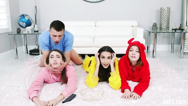 Description:Natalia Nix is excited to have her two best friends Dani Damsel and Dakota Burns over for a movie night slumber party, so they get their onesies on, their popcorn ready and lay in the living room to watch a movie. Little did they know that Natalia’s stepbrother Johnny had placed a secret camera and is challenging himself to turn all three girls' attention on to his huge dick.