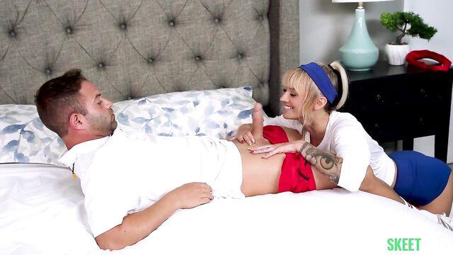 Description: The summer Olympics are coming and Katee is desperate to get an edge over the competition. In dire need of training, she hires coach Nicky Rebel, a strict instructor who makes her students go the extra mile. The coach's methods are weird but are meant to help Katee’s stamina, so she accepts each and every one of his exercises. First, the blonde needs to shake that fine ass of hers repeatedly to really push her flexibility. Bouncing her butt makes it firm so she can get the proper muscle to win the game. Up next, the coach sends her to the net to practice her blocks while massaging her pussy. This is the perfect exercise to ensure that Katee is at her best game. The final training involves a lot of cardio and extra sweat: a nasty fuck session with Nicky. Katee really wants to be the MVP, so she gives her 110% to Nicky’s cock, sucking and eating it up with her cunt.