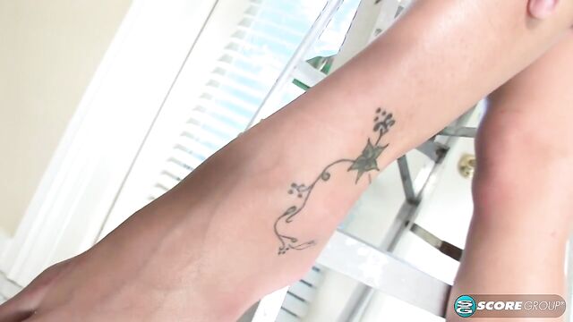 Description: I get turned on when I touch my own feet and fondle my cute toes, says long-legged blonde Ashlynn. "Especially when someone is watching me. I like to do things with my feet, too. I used my toes to pick up a paintbrush and paint the walls. And that was fun, but what was even more fun was sitting on the ladder and looking down at my friend who filmed me. I know that he likes feet, too, so it was kinky to sit above him and have him watch me play with my soles and get turned on. Sitting above him gave me a sense of power. It made me feel like a queen on a throne. Next time, I am going to make him suck my feet while he sits beneath me."