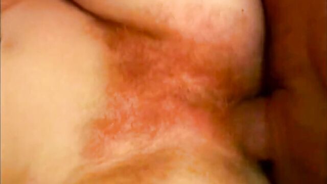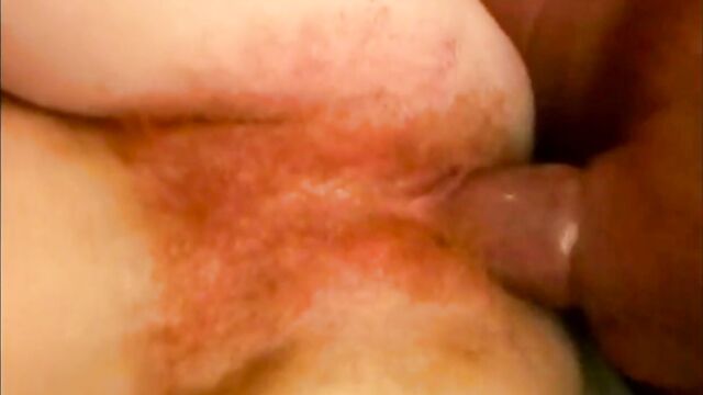 Description: Hairy redhead bitch pounded on her bed and gets her huge bush covered with his thick white load.