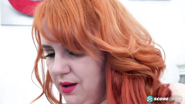 Redhead BBW Katrin Porto nicely plays with her shaved pussy