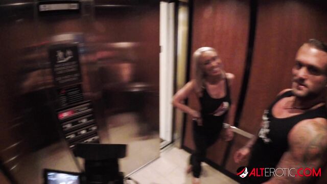 Description: Blonde babe Vanessa Skye is undeniably excited to make a video for Alterotic. From the moment she stepped inside the elevator until she enters the room, it is noticeable that she has been waiting for this day to come. And finally she is here, inside the bedroom where everything happens. Vanessa wastes no time as she excitedly begins her steamy make out session with a hot man. She strips off her top revealing a Hello Kitty tattoo on her back. He grabs her boobs, showing off an elaborate tattoo with a woman’s face on the back of his hand, and starts sucking the nipples until they are fucking hard. On his arm is a tattoo of a brawny man holding a trident. With both of them fully naked now, Vanessa kneels down on the bedroom floor. As she grabs his penis, her dollar sign tattoo on her ring finger is exposed.