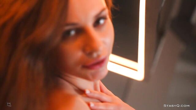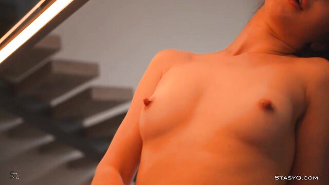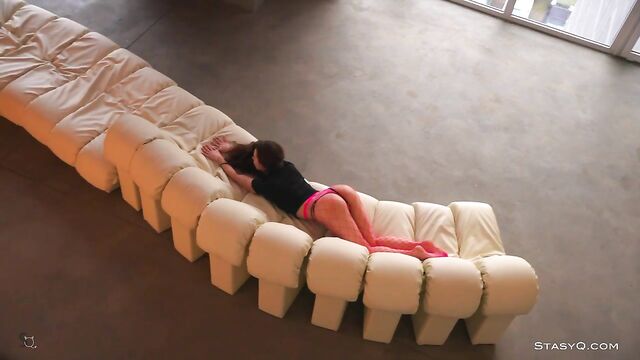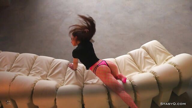 Description: This StasyQ model stands out for her exotic vibe and long, curly hair. Her name is Karina Moons, and she's the star of Video Release 652. It's all elegant and seductive, but a pair of the vixen's pink fishnets gives an edge to this superb striptease show. It all takes place in a well-lit apartment with a big sofa and a stone wall. Karina Moons quickly hops on the nearby sofa to show off her beautiful feet and toes. She wiggles them up in the air while her long curls touch her breasts. They are perky and firm, giving the seductress the looks of a naughty ballerina. Once topless, the brunette gets on a wooden table where she continues to explore her curves and show off her slender body. If you stay long enough, you will see Karina Moons fully naked, cuddling on that big, white sofa.