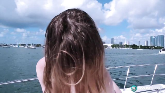 Description: Occupation: Cashier; Age: 20; Born: April 7; Ht: 5'5"; Wt: 115 pounds; Bras: 32A; Panties: Whatever; Anal: I like the idea; BJs: Swallow; Masturbate: Duh! One of the highlights of our job is flying young amateurs down to Miami for fun in the sun. Emma brought her skimpiest bikini, so we gave her a yacht to enjoy while we shot her spreading her pussy on-camera for the first time. As we shot, we talked to her about her life and her turn-ons. "I have two big sex fantasies that I want to make come true. First, I've always wanted someone in a full-length and shiny black leather suit and mask to fuck me silly while I'm tied up. Second, I want to hook up with a girl with a strap-on. My favorite position is doggie-style, but I would want to do a chick in missionary so I could play with her tits as she fucked me. "Oral is my favorite. I love sucking cock and licking balls. I've even given a few guys rimjobs before. I adore the taste of jizz, too. In fact, everything about cum is great. If I could find enough guys, I'd want to do a bukakke."