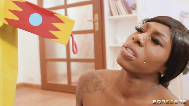 Description: Ebony Mystique's bath is interrupted by an unexpected delivery. Mystique is at first confused by the large mystery box, but quickly figures out that she's dealing with the latest sex toy sensation... a Jordi in the Box! Mystique didn't ask for this Jordi in the Box, but now that it's here, she knows how to use it; first sucking Jordi's cock, then letting him give her a good fuck.