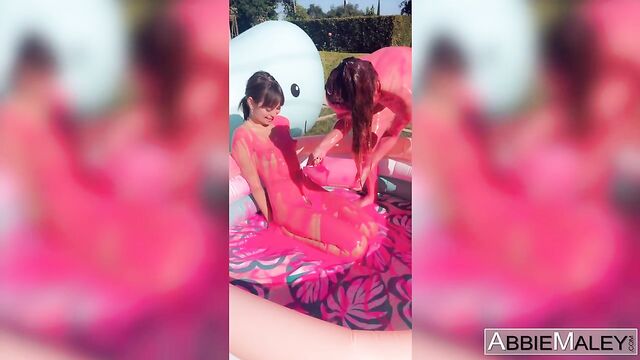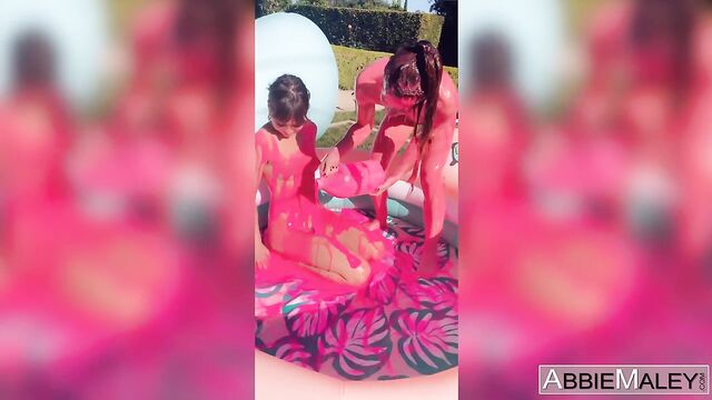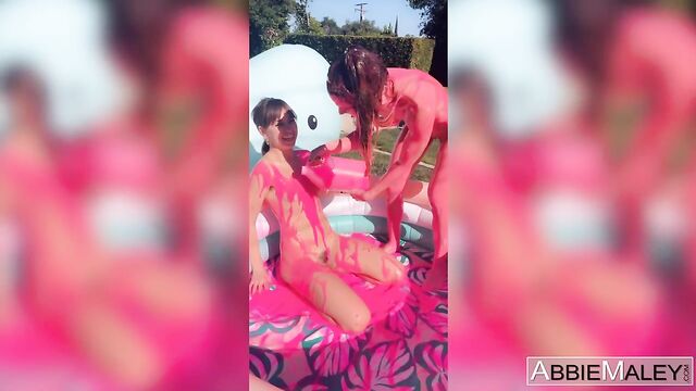 Description: Riley Reid and Abbie Maley cover each other's petite naked bodies in hot pink paint while outside in an inflatable pool.