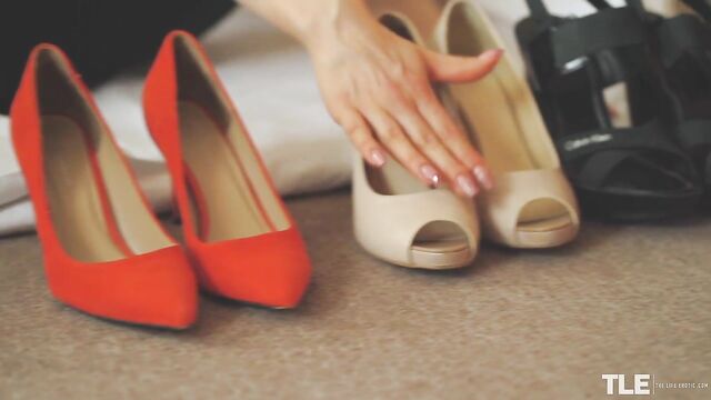 Description:Sexy Dominica, a tall and slender tattooed blonde from Belarus, walks into her bedroom. She is wearing a sleeveless black leotard over large-mesh red fishnet pantyhose, and a pair of red suede spike-heeled pumps. She sits on the floor and removes one shoe then rubs the sole against her body, playing it toe-first against her crotch before stroking herself with the heel. She sets it aside, removes her other shoe and gives it the same treatment. She has three more pairs of heels lined up to play with and runs her French-tip manicure over them. Turned on, she begins to finger her pussy through the crotch of her leotard, then peels it off and tosses it aside. She rips a hole in her pantyhose, directly over her juicing, shaved pussy and slips a finger inside. Her other hand cups and caresses her small breasts, and she tastes herself off of her fingertips. She continues to masturbate, sighing and moaning as her pleasure builds and, with two fingers inside, she slows down for a while, not wanting to cum too quickly. She throws her head back, eyes closed in bliss as she sprawls on the floor, then she gazes down at her pussy as she plays with it. Next, she lies on her side and reaches back, grabbing a cream-colored peep-toe pump as she continues to pleasure herself. She bites her lip and rolls onto her belly, ass cheeks quivering as she frigs herself hard from behind. Her cries get louder and at last she cums, licking and nuzzling her shoes as she relishes the afterglow...
