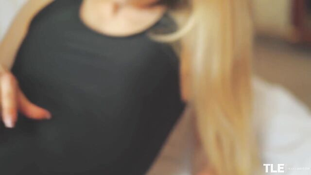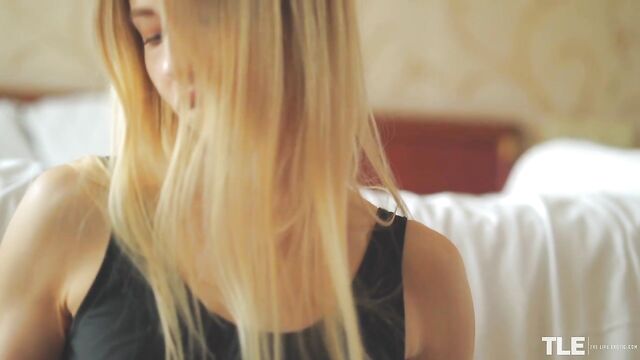 Description: Sexy Dominica, a tall and slender tattooed blonde from Belarus, walks into her bedroom. She is wearing a sleeveless black leotard over large-mesh red fishnet pantyhose, and a pair of red suede spike-heeled pumps. She sits on the floor and removes one shoe then rubs the sole against her body, playing it toe-first against her crotch before stroking herself with the heel. She sets it aside, removes her other shoe and gives it the same treatment. She has three more pairs of heels lined up to play with and runs her French-tip manicure over them. Turned on, she begins to finger her pussy through the crotch of her leotard, then peels it off and tosses it aside. She rips a hole in her pantyhose, directly over her juicing, shaved pussy and slips a finger inside. Her other hand cups and caresses her small breasts, and she tastes herself off of her fingertips. She continues to masturbate, sighing and moaning as her pleasure builds and, with two fingers inside, she slows down for a while, not wanting to cum too quickly. She throws her head back, eyes closed in bliss as she sprawls on the floor, then she gazes down at her pussy as she plays with it. Next, she lies on her side and reaches back, grabbing a cream-colored peep-toe pump as she continues to pleasure herself. She bites her lip and rolls onto her belly, ass cheeks quivering as she frigs herself hard from behind. Her cries get louder and at last she cums, licking and nuzzling her shoes as she relishes the afterglow...