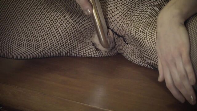 Description:Gorgeous, auburn-haired babe Raisa has been chained up to metal bars set into a wooden landing at the top of a modern staircase. She is wearing only a black lace bralet top and fishnet pantyhose, plus a bondage collar. The chain has been wrapped around her waist and the ends are shackling her wrists, secured with padlocks. She struggles against her bonds, rattling the links, then spots a box on top of a low chest on the platform. Using her hose-clad feet, she deftly retrieves it and finds a key inside, along with a chrome vibrator. She uses the key to remove the padlocks and, after freeing herself from the chain, unwraps the vibe. She sits on the chest and buzzes her shaved pussy through the mesh of her pantyhose, tearing a hole in the crotch as she becomes increasingly horny. Her hands wander as she licks her own juices from the toy, then she grinds it against her slit once again. Splaying herself wider, she slides it in her snatch, pumping and stirring it slowly as she sighs with pleasure. She moves to sit on the staircase and continues to masturbate wth one elegant leg raised, teasing her clit. Setting the vibe aside for a moment, she removes her bralet to expose small, perfect breasts with caramel-brown nipples. Then she moves further down the staircase and slips her vibe back in, her breaths now deeper and punctuated by moans. Her pussy slurps around the toy and she groans out loud as she cums, then licks and caresses the shaft and tip as she enjoys the afterglow of her orgasm. Finally, she descends the staircase, vibrator in hand, just before the picture fades...